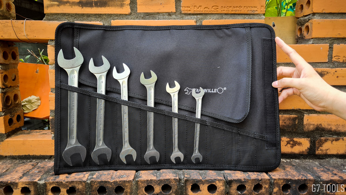 Cờ lê với kích thước tiêu chuẩn hệ mét, gồm 2 đầu miệng từ size 10-22mm, được đựng trong túi cuộn.