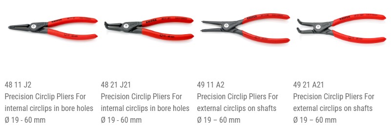 - Knipex 49 21 A21: mở phe ngoài - mũi cong, mở phe đường kính 19-60mm