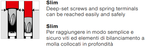 Slim là phần nhựa cách điện phẳng liền mạch, không chênh với phần mũi thép. Tiện ích này giúp thao tác không bị vướng và mũi vít có thể luồn sâu hơn.