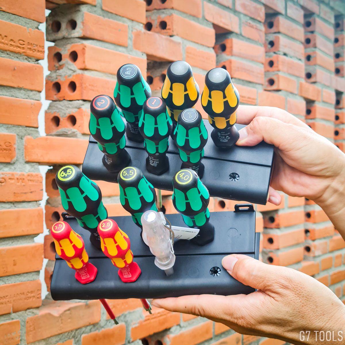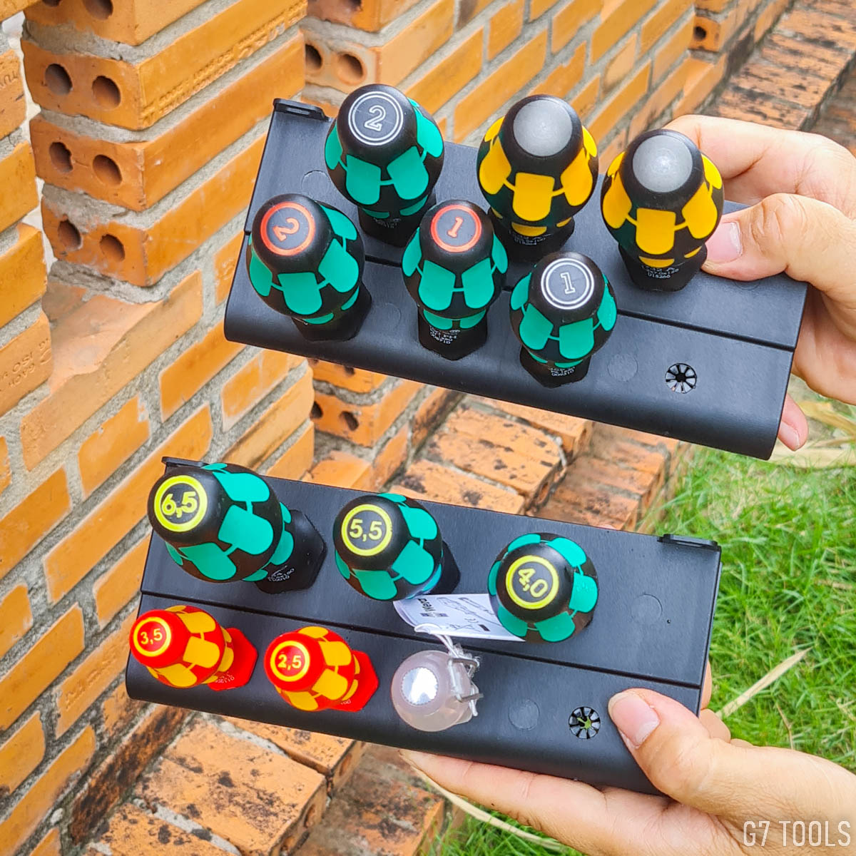 Hệ thống "Take it easy": mã màu theo từng loại đầu vít và dấu kích thước, giúp nhận diện và lấy công cụ nhanh chóng.