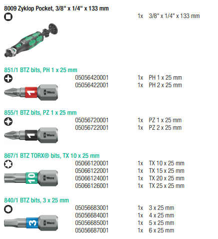 EAN: 4013288221834 Size: 165x70x35 mm Part number: 05004280001 Weight: 255 g Article number: 8009 Zyklop Pocket Set 1 Country of origin: CZ Customs tariff number: 82079030 Compact Zyklop ratchet with integrated bit magazine Thanks to it's clever design the ratchet head doubles up as both a 3/8" square drive ratchet for sockets, and integral 1/4" hexagon drive for screwdriver bits Freely pivoting ratchet head with 5 predefined locking positions Fine tooth reversible ratchet (72 teeth) for a low return angle of only 5° Captive and freely swivelling bit magazine for easy removal and secure storage of the bits Compact Zyklop ratchet with bit magazine for the pocket. Magnetic direct mounting for ¼" bits and 3/8" sockets. Rapid tool change thanks to the non-locking mounting. As the head is lockable at 0°, 15° and 90°, the tool can be used as a ratchet and as a ratchet screwdriver. The fine toothing with 72 teeth allows for a low return angle of 5°. Wide range of applications thanks to 12 bits integrated in the handle. The robust ratchet mechanism allows for ample torque. Perfect combination of a Zyklop ratchet with a 12-piece screwdriver set.