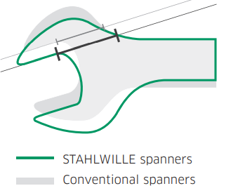 Phần ngón tay cái tì xuống dọc theo thân cờ lê được làm rất mỏng để giảm trọng lượng. Thiết kế cờ lê Stahlwille cũng tương tự nguyên tắc dầm thép chữ H trong xây dựng, khả năng chịu tải lớn đạt được với trọng lượng thấp hơn.