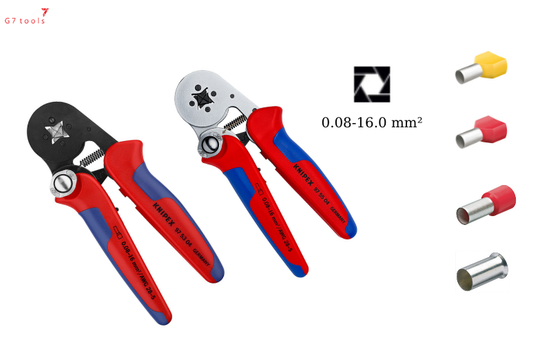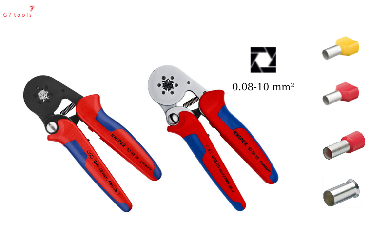 Knipex có 2 mã kìm cho ra cấu hình lục giác là 97 53 14 và 97 55 14. Thật ra chúng chỉ khác nhau về lớp mạ. Một chiếc là mạ đen và chiếc kia là mạ chrome để hạn chế gỉ sét. Nếu hình vuông bấm được tiệt diện 0.08-16.0 mm², cấu hình lục giác bấm được 0.08-10 mm² mà thôi.