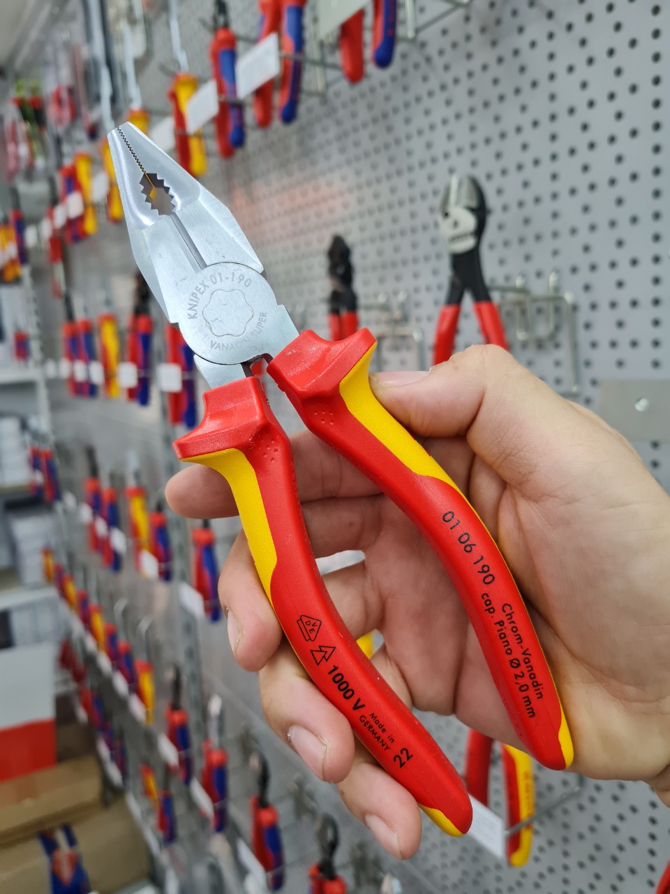- Nhận diện cách điện bằng 2 màu đỏ và vàng; có logo VDE (2 cây thông xếp chồng lên nhau)
