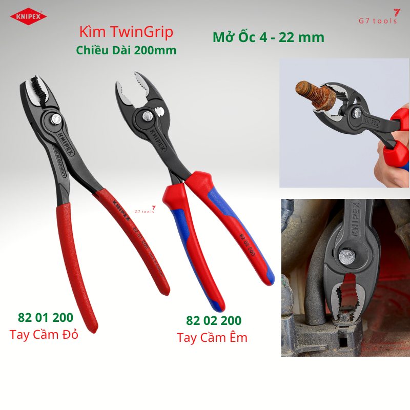 - Nếu muốn nhổ rút đinh hay nhổ ốc cứng đầu, ốc gỉ sét. Hãy chọn thêm chiếc Knipex TwinGrip 82 01 200 hoặc 82 02 200 (nhấp vào hình cuối trang để xem thêm)