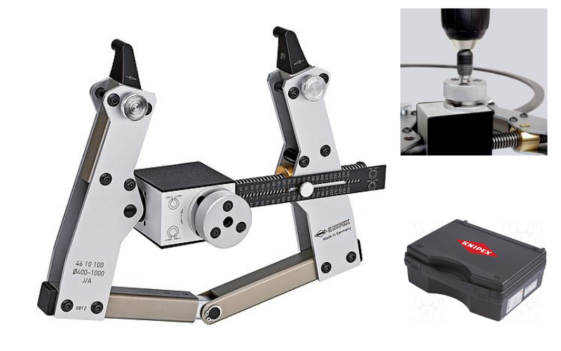 Ngành điện gió hay năng lượng mặt trời có những vòng phe to khủng hơn, Knipex có kìm mở phe đa năng Trà Củ Gai An Thái Phương Knipex 46 10 100 mở trong, mở ngoài và mở mọi vị trí. Dụng cụ này có thể mở đường kính từ Ø 400 cho đến 1.000mm (1 mét). Kìm mở phe Knipex 46 10 100 được đóng trong thùng chống sốc và có kèm theo phụ kiện mũi phe đi kèm.