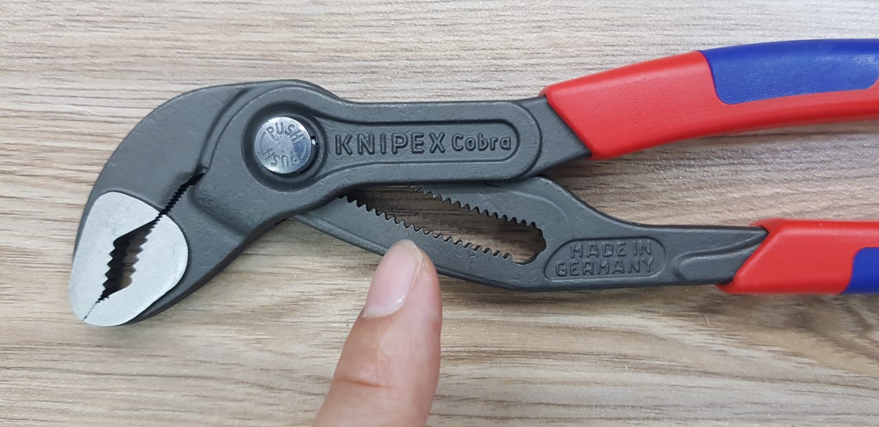 Kìm nước Cobra Knipex dài 250mm có đến 25 mắt điều chỉnh (adjustment positions). Trên thanh trượt, các mắt điều chỉnh nhỏ và mịn. Vì vậy, thay đổi kích thước kẹp trở nên rất dễ dàng, thuận tiện và năng suất làm việc cao hơn hẳn. Dù cho mắt trượt trông nhỏ và mảnh mai nhưng Knipex bảo hành suốt đời, miễn là bạn đừng cố ý phá hỏng nó.