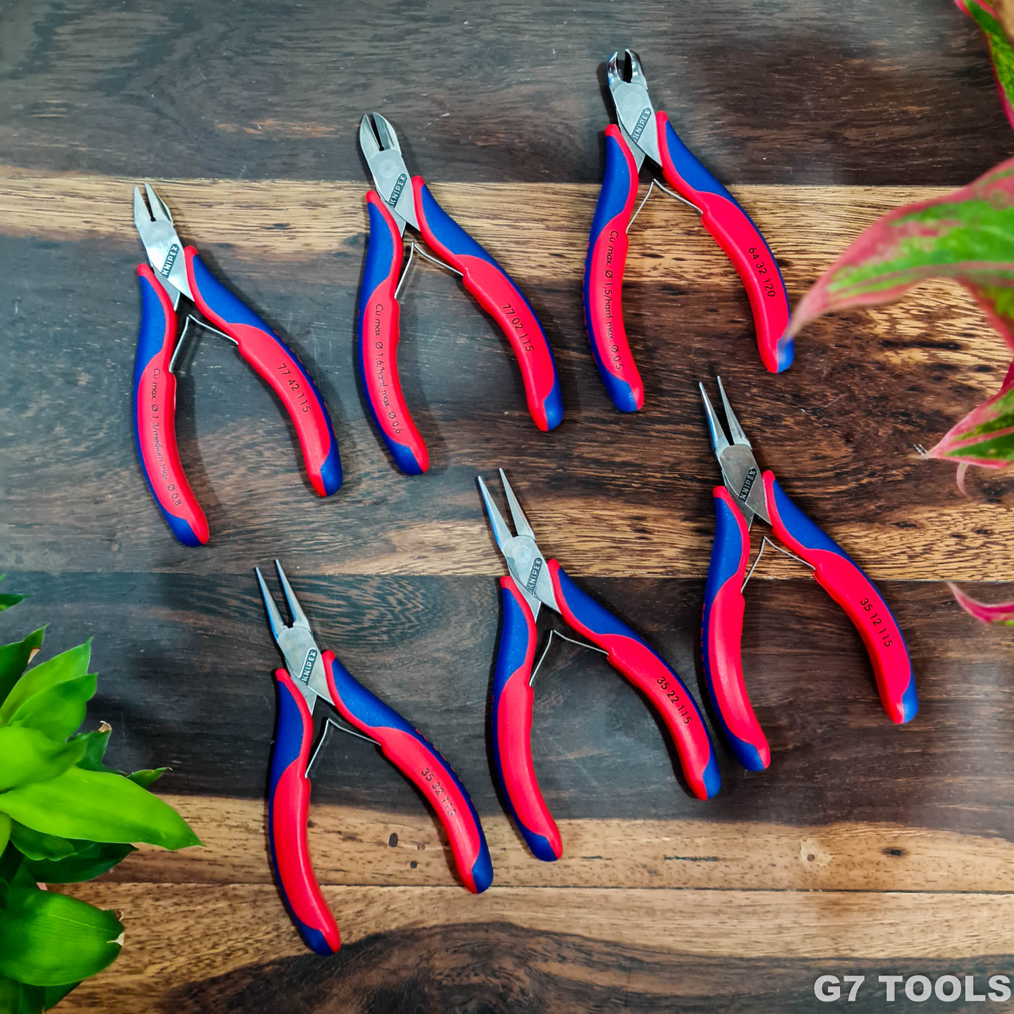 Bộ kìm Knipex 00 20 16 bao gồm các loại kìm chuyên dụng như kìm cắt chính xác, kìm kẹp mũi nhọn, và nhíp chính xác, đáp ứng nhiều mục đích khác nhau trong công việc lắp ráp và bảo trì thiết bị điện tử.