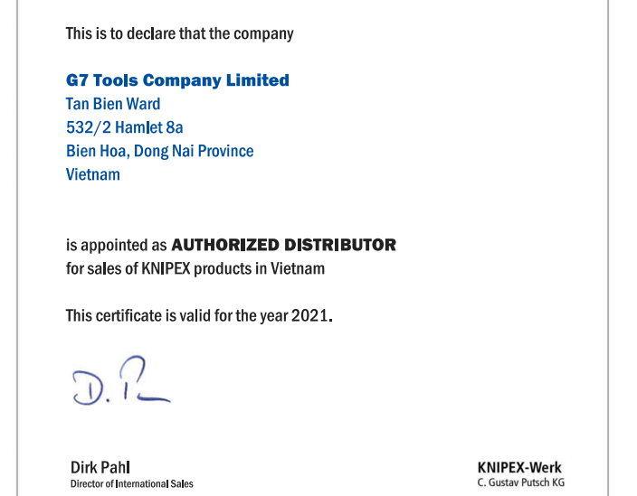 Kìm Knipex tại Việt Nam, hiện tại, có nhiều địa điểm kinh doanh nhưng nếu bạn cần tư vấn chuyên sâu hay phục vụ chu đáo, vui lòng liên lạc G7 Tools – công ty nhập khẩu Kìm Knipex lớn nhất tại Việt Nam. Để đặt hàng online, vui lòng ghé trang web www.g7tools.com hoặc số điện thoại 0981 222 034 (Zalo) để tư vấn, email: nancy.phung@g7tools.com. Hoặc cách nhanh nhất và tiện lợi, ghé shop bán hàng G7 Tools tại 182/22 Lê Văn Sỹ, Phường 10, Quận Phú Nhuận, TP.HCM.