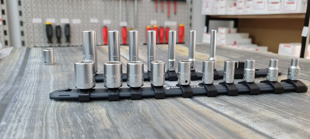 Khay gắn khẩu 1/4" (6,3mm) có bi tròn nên rất dễ tháo lắp. Chiều dài khay 255 mm có thể gắn được 10 khẩu (socket) 1/4". Vị trí từng đốt khẩu có thể di chuyển được.