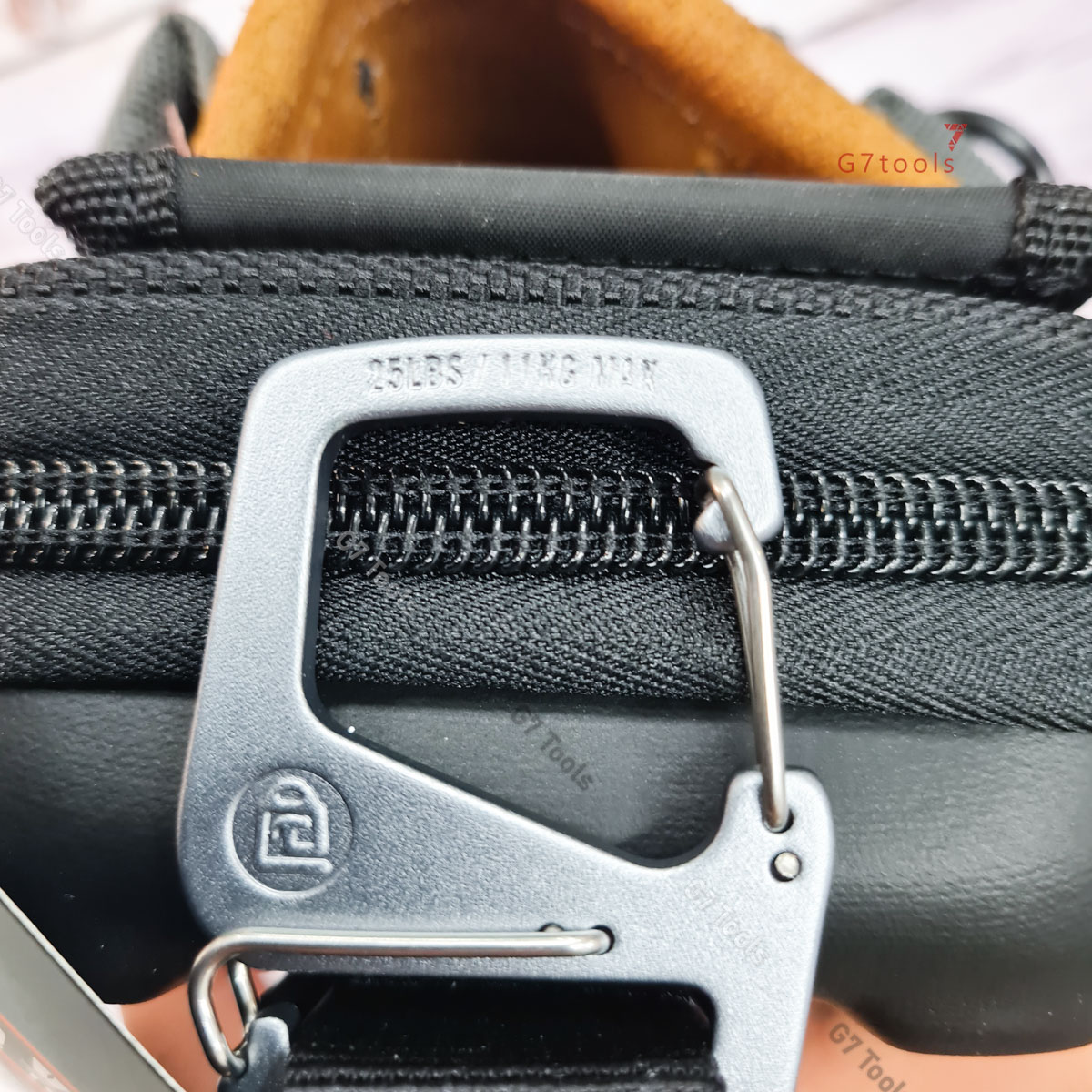 Mặt trước có một túi dụng cụ tháo rời với hai ngăn chính cho tua vít hoặc kìm, hai ngăn xuyên suốt, ngăn bút, kẹp thước cuộn bằng thép không gỉ và dây đai giữ băng keo điện.