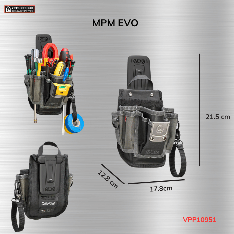 MPM EVO (Medium Multimeter & Tool Pouch) là dòng túi phụ trợ sizze trung bình thuộc hệ thống EVO mới nhất của Nhà Veto. Được thiết kế với 11 ngăn đứng chuyên dụng, túi tập trung vào việc bảo vệ thiết bị đo (Multi-meter) và các dụng cụ cầm tay thiết yếu. Điểm khác biệt lớn nhất nằm ở Hệ thống Clip-on thông minh, cho phép túi không chỉ đeo bên hông mà còn có thể "biến hóa" linh hoạt khi kết hợp cùng các dòng túi lớn hơn.