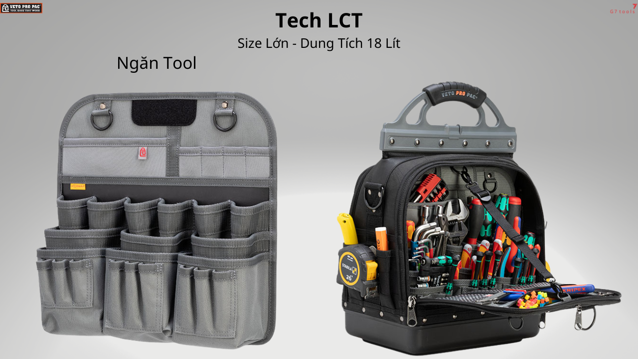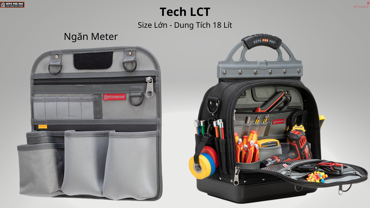 VETO Tech LCT là túi dụng cụ size Lớn 18 Lít chứa được thước đo, ampe kìm, máy khoan, kìm búa, tua vít và các phụ kiện khác.