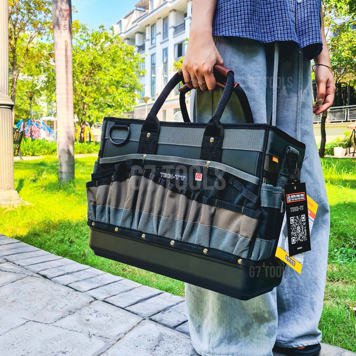 1. Chất lượng vượt trội: Được làm từ chất liệu Polypropylene đúc cứng ở đế và vải sợi nilon 1200 PVC denier cao cấp, Tech-TT có khả năng chống nước, chống mài mòn và chịu được điều kiện làm việc khắc nghiệt. Cấu trúc khung thép bên trong giữ cho túi luôn vững chắc, không bị biến dạng khi đầy dụng cụ.
