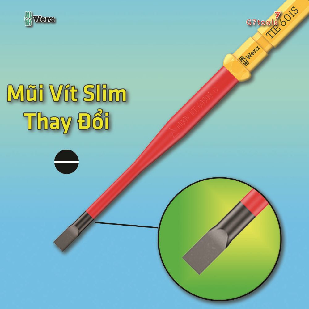 Thiết kế thân mỏng (Reduced Shaft Diameter): Đường kính thân lưỡi vít được giảm, cùng với lớp cách điện tích hợp, cho phép tiếp cận và thao tác với các vít nằm sâu hoặc các bộ phận lò xo dễ dàng, điều mà lưỡi vít VDE thông thường không làm được.